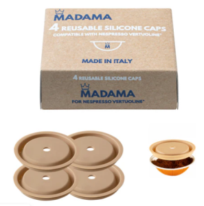 Madama to nakrętka wielokrotnego użytku do Nespresso Vertuo i VertuoLine wykonana z silikonu przeznaczonego do kontaktu z żywnością, wolnego od BPA i BPS. Teraz możesz używać jednorazowej kapsułki Vertuo tyle razy, ile chcesz, po prostu zdejmując aluminiową osłonę i zastępując ją wielorazową nasadką Madama. Zakrętka wykonana w całości we Włoszech, przy użyciu najwyższej jakości materiałów, współpracuje ze wszystkimi mieszankami espresso dostępnymi na rynku. Dzięki nakrętce wielokrotnego użytku Madama możesz pomóc zatrzymać zanieczyszczenia, oszczędzając nawet do 80% w porównaniu do jednorazowych kapsułek i wreszcie wybrać to, co pijesz, bez obaw o swoje zdrowie.