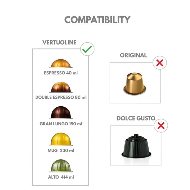 KOMPATYBILNY: Nakrętka Madama jest kompatybilna z kapsułkami Nespresso Vertuo i Nespresso Vertuoline wszystkich rozmiarów: 40 ml, 150 ml, 230 ml, 414 ml i 532 ml